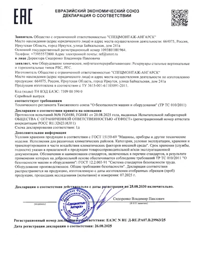 Декларация о соответствии стальных резервуаров РВС и РГС требованиям Технического регламента Таможенного союза «О безопасности машин и оборудования».