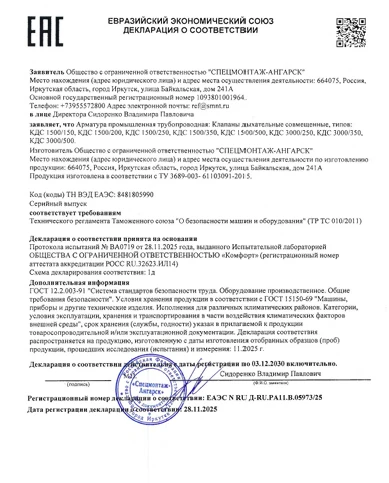 Декларация о соответствии арматуры промышленной трубопроводной, клапанов дыхательных совмещённых типа КДС требованиям Технического регламента Таможенного союза «О безопасности машин и оборудования».