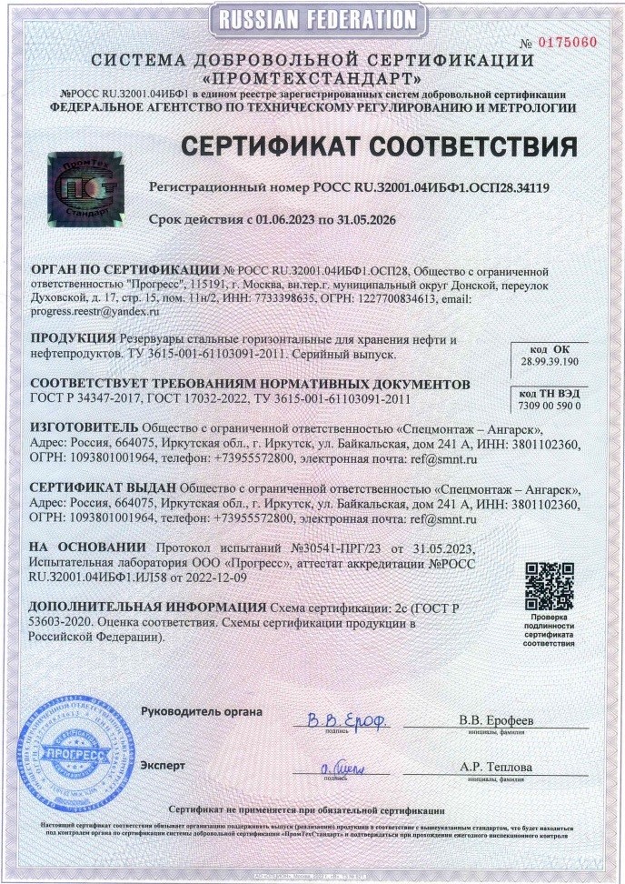 Сертификат соответствия требованиям нормативных документов резервуаров стальных горизонтальных для хранения нефти и нефтепродуктов.